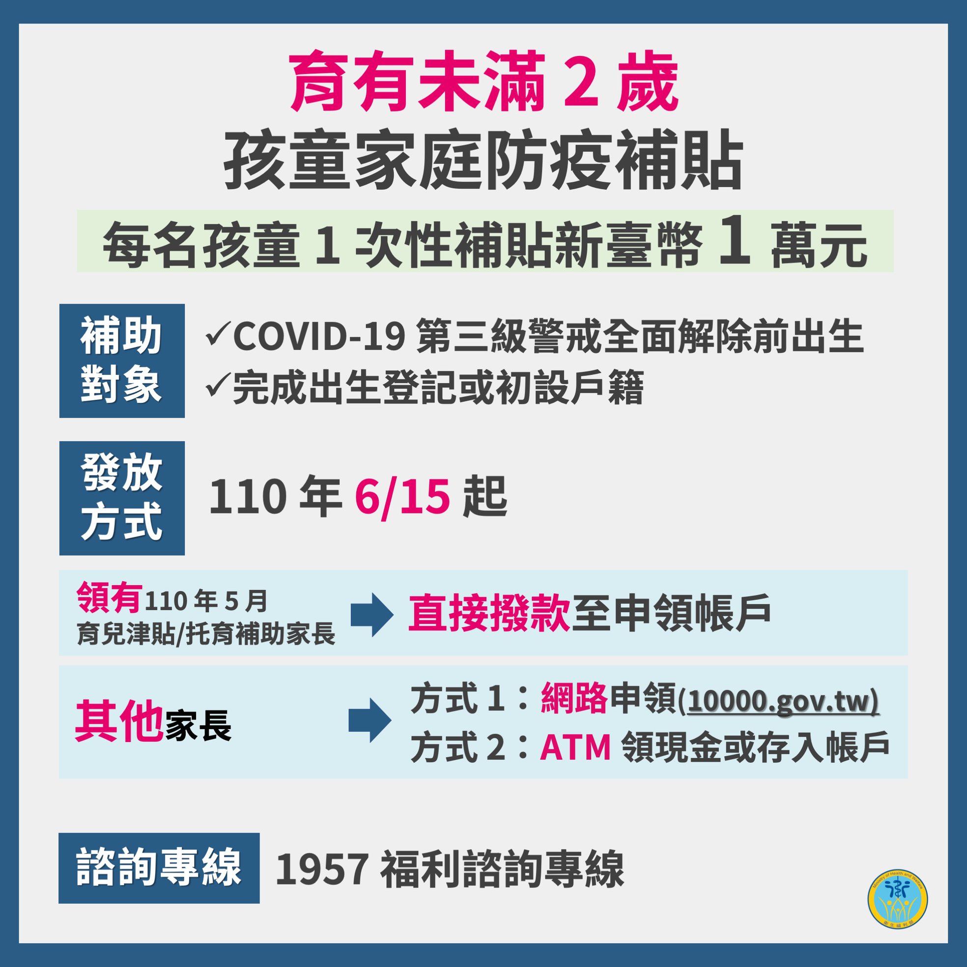 © 由 青年日報 提供 行政院「孩童家庭防疫補貼」今日上午10時開放網路申請,18日開放實體atm領取,至9月30日截止。 (取自教育部臉書) © 由 青年日報 提供 民眾上網登錄孩童的健保卡號、監護人身分證號及金融機構帳.